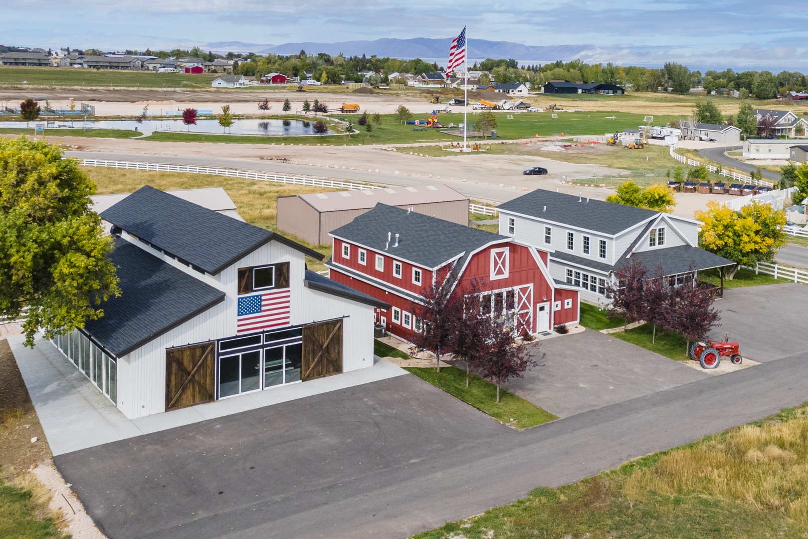 ...Aerial View (L to R) Pool House - Barn - Cedar Farmhouse